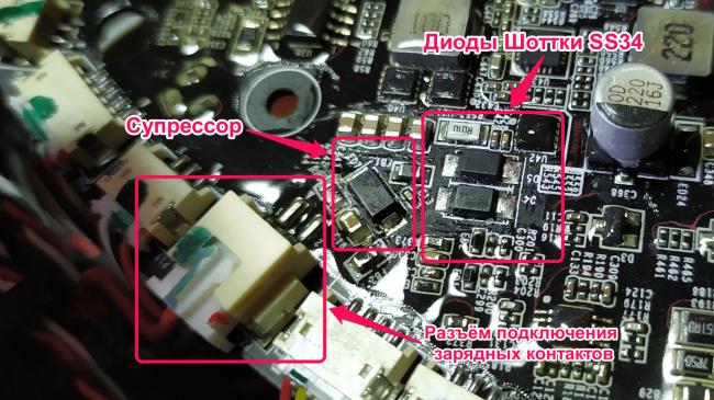 Неподалёку от диодов Шоттки смонтирован супрессор, защищающий входную цепь. На плате он отмечен, как ED7. Подобные супрессоры имеются в разных частях материнской платы, а также на плате зарядной док-станции.