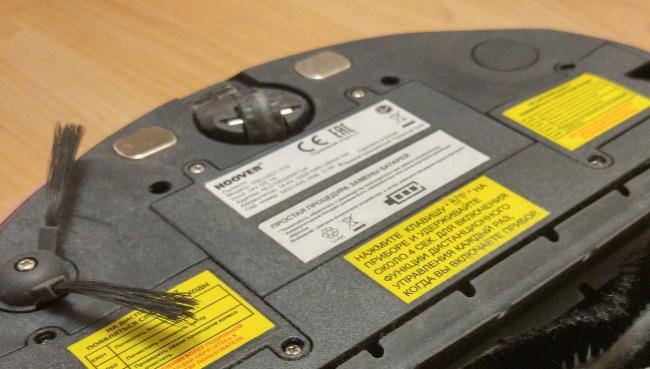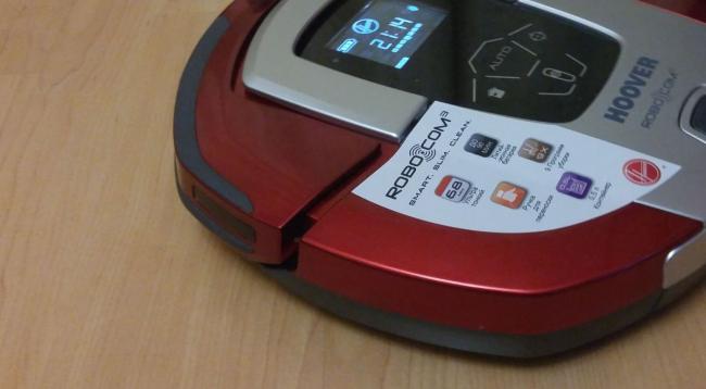 У нас на тесте побывала базовая модель Hoover RoboCom 3 (RBC 040 019), которая имеет одну боковую щетку оснащена средним по емкости аккумулятором. Управлять роботом можно с помощью сенсорной панели на корпусе или через пульт ДУ.