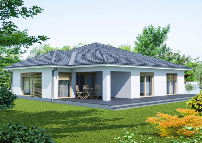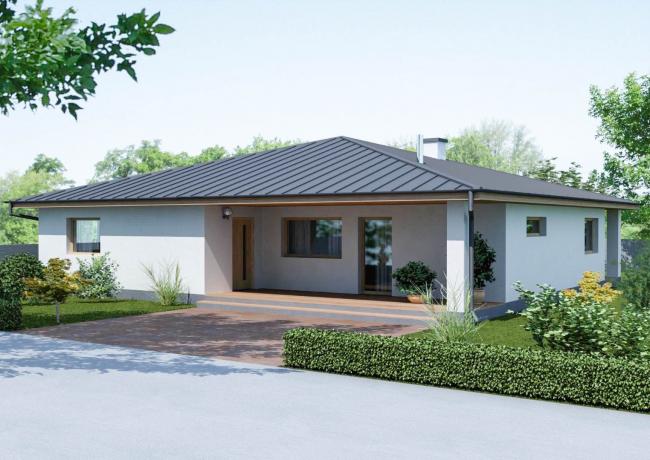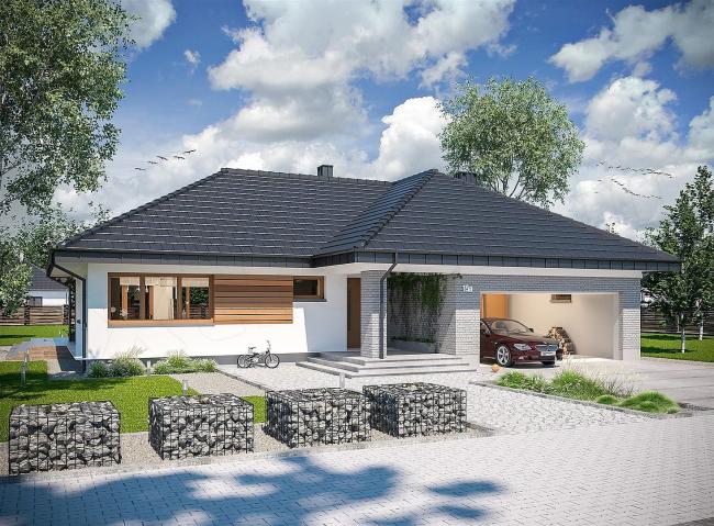 Z141 — это очень эффектный, рациональный и красивый загородный дом. Большие панорамные окна, вальмовая кровля, акриловая штукатурка и натуральный планкен, это и выделяет проект на фоне других домов.