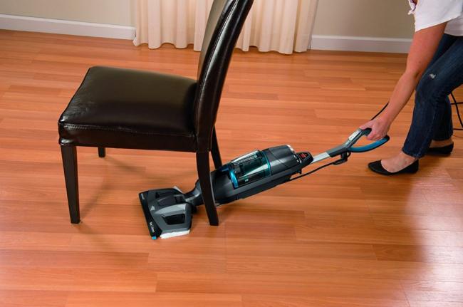 Достойное место в рейтинге паровых швабр-пылесосов занимает Bissel 1977N. Внешне немного громоздкий, но собрать его несложно. На ручке находится регулятор мощности пара, а также кнопка включения режима пылесоса.