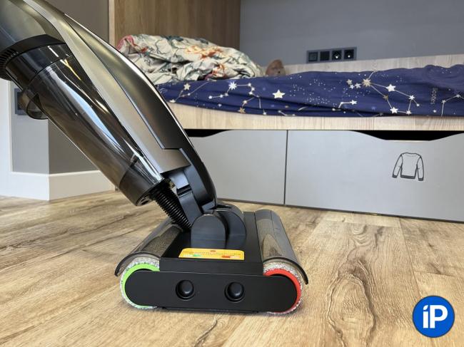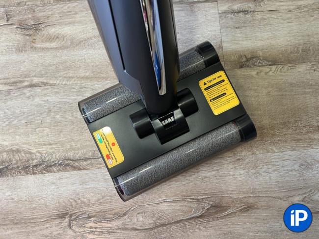 Отмечу, что щетки для мытья пола удалены от краев корпуса с разным расстоянием. С левой стороны удаление сантиметра 4, а с правой всего 6 мм. Так что проходиться пылесосом по углам надо именно правой стороной девайса.