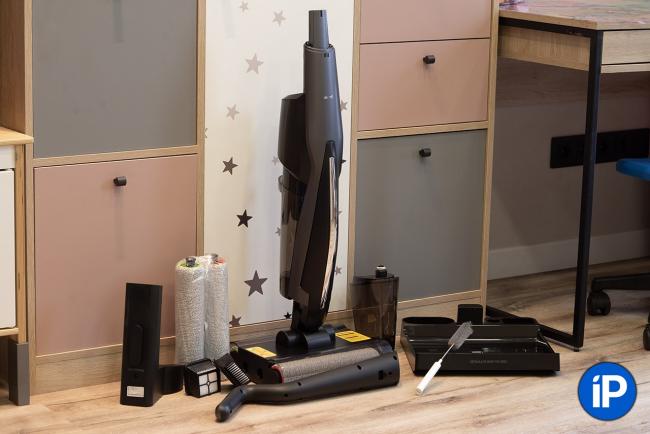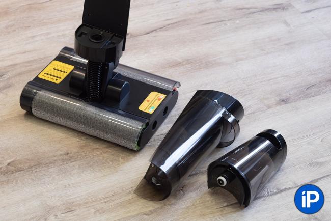 Сам пылесос поставляется в разобранном виде. Однако собрать это не составит труда — нужно только прикрепить верхнюю ручку и набрать воды в специальный встроенный контейнер.