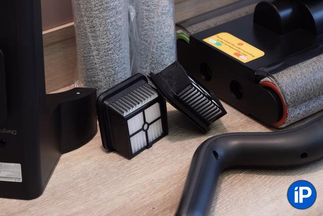 В комплекте с устройством лежит дополнительный набор валиков, документация, два НЕРА фильтра с защитной сеткой (третий уже установлен на девайсе) и щетка «2-в-1» для прочистки щетки для пола и срезания волос.