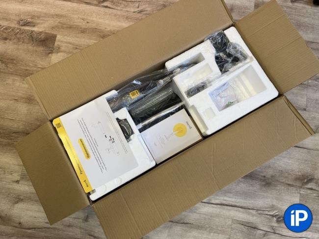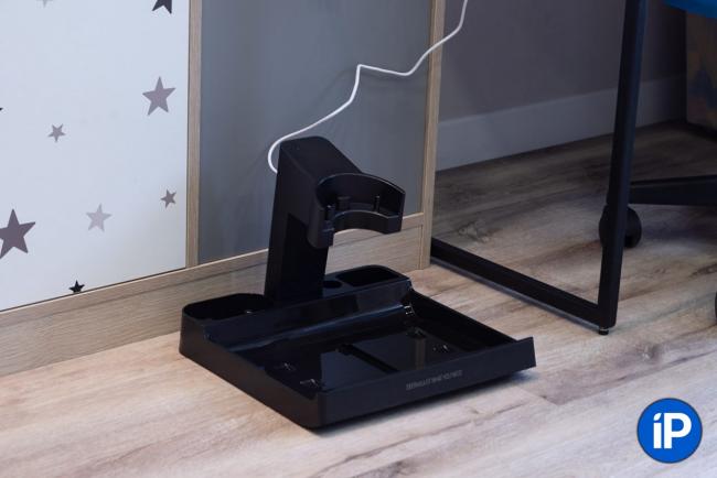 Но это не всё. К пылесосу также идет зарядная станция (тоже в разобранном виде) и адаптер питания к ней. Сама станция собирается в одно действие — ставишь крепление для пылесоса сзади и подключаешься к розетке. Всё.