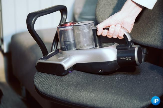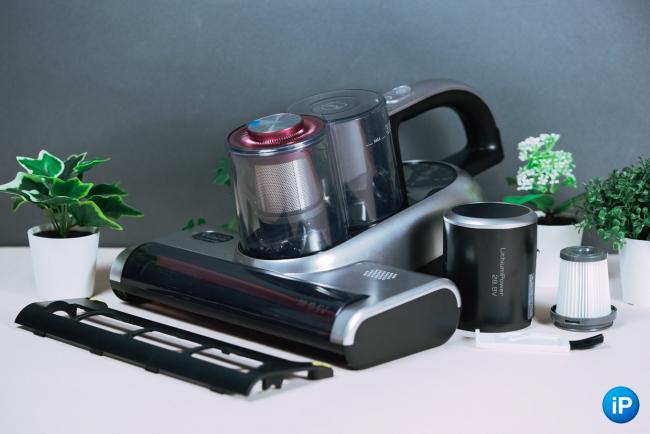 За обеззараживание отвечает ультрафиолетовый излучатель. Он же уничтожает пылевых клещей. Он включается, когда пылесос прилегает к поверхности и отключается, если устройство поднять, в глаза светить не должен.