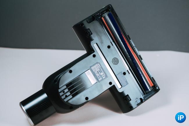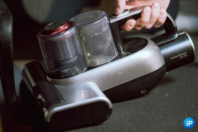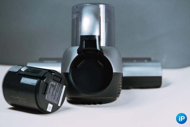 Батарея вставляется в тыловую часть пылесоса. Нужно нажать на кнопку фиксатора в верхней части слота и вщёлкнуть его туда. Вытаскивается по тому же принципу.