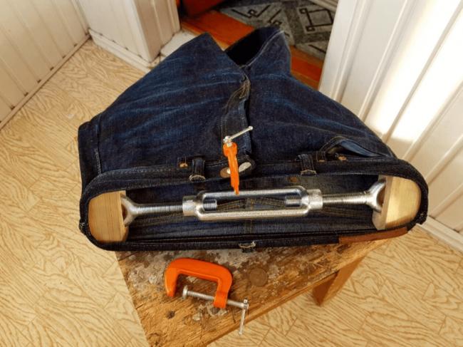 Для того чтобы усилить эффект, используйте длинные плечики или столярную автоматическую струбцину. В принципе, можете использовать любой материал, который был бы шире ваших брюк. Главное, выдержать джинсы в таком состоянии хотя бы несколько часов.