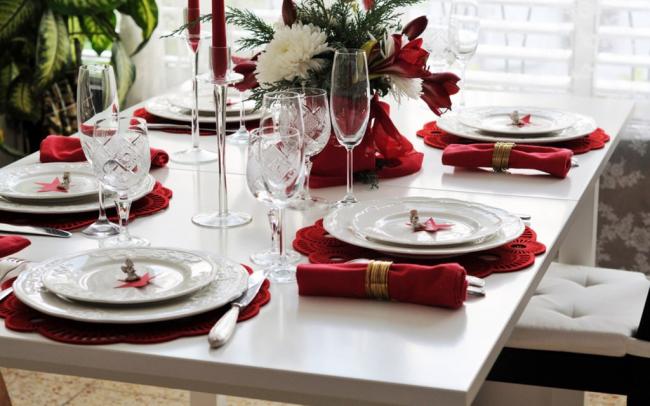 Постелите красивую скатерть, положите яркую дорожку, подберите салфетки в тон, поставьте цветы.