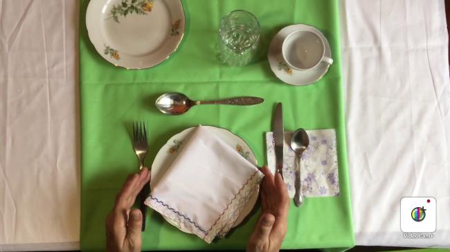 - На тарелку, перед каждым гостем кладётся салфетка, которая будет лежать на коленях, её можно красиво оформить, свернув и перевязав ленточкой или выставить в виде какой-то фигуры.