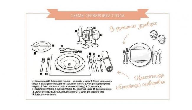 В сервировке стола следует все внимание уделить правильной расстановке приборов и столовой посуды, а также декоративных элементов. Посуду расставляют, согласно четким правилам сервировки: