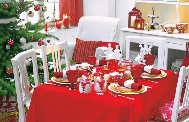 Новый год или Рождество, проводимые в красно-зеленой тематике – это классика. Клетчатые салфетки, красная скатерть, еловые шишки, леденцы в полосочку, носки Санты и белые свечи. Такое оформление считается одним из самых стильных и является довольно таки традиционным в Америке, где Новый Год можно назвать основным праздником. Также можно сделать более спокойный дизайн, разместив украшения ярких цветов на белоснежной скатерти.
