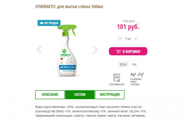 На сайте на момент проверки не было информации о наличии этаноламина и пропиленгликоля в бытовой химии для мытья стекол и зеркальных поверхностей. Хотя эти вещества в ней присутствуют. Они запрещены к использованию в натуральной косметике. А этаноламин является контактным ядом, способным провоцировать аллергические приступы. Такие компоненты не должны присутствовать в экологичной бытовой химии.