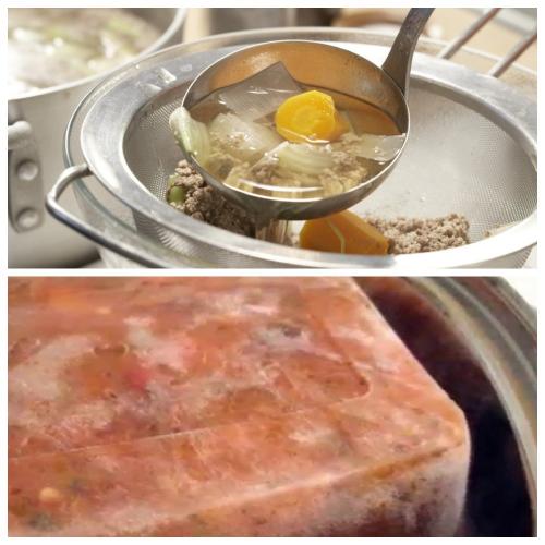 Его охлаждают, в процессе сверху образуется прослойка жира, как в холодце. Жир удаляют, а полученное желе нарезают на кубики и помещают в морозилку.