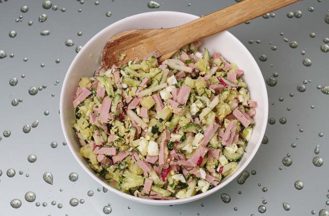- нарезаем подготовленные для блюда продукты и тщательно перемешиваем полученную массу;