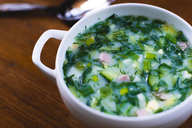 Окрошка – один из самых популярных холодных супов. Особенно часто её готовят в летнюю жару, поскольку блюдо оказывает хороший освежающий эффект. Готовится из отварного мяса, колбасы или рыбы, варёного картофеля, яиц и свежих овощей или солений. Как и другие готовые первые блюда обладает коротким сроком хранения, поэтому употреблять её желательно сразу после приготовления. При необходимости можно сохранить в холодильнике в течение нескольких дней.