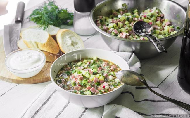 На первом этапе приготовления делают заготовку, нарезают овощи, яйца, зелень и мясо. Смешивают компоненты и отправляют кастрюлю с составом в холодильник. Отдельно подготавливают несколько вариантов заливки, чтобы каждый смог выбрать его на свое усмотрение. Напитки также отправляют в холодильник на несколько часов перед подачей. Нарезку раскладывают порционно по тарелкам, заливают напитком до достижения требуемой густоты. Добавляют соус: сметану или майонез.