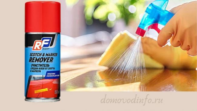 Это очень хороший очиститель, он может убрать любое загрязнение с различных поверхностей. Для очистки нужно пропитать салфетку, а после протирать место, где остался клей. Все следы уйдут очень быстро.