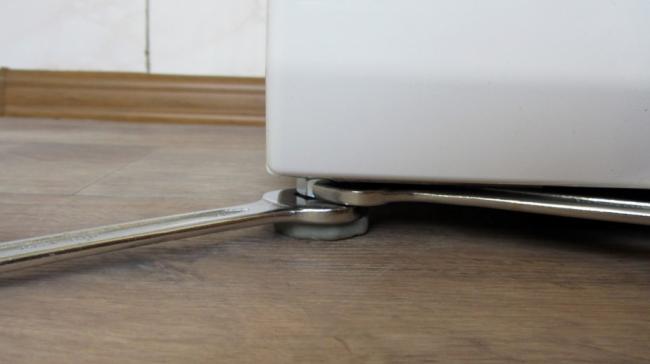 Для выравнивания не нужно подкладывать под стойки стиральной машины кусочки линолеума, дерева или пластмассы. С этой целью используются ножки изменяющейся длины и специальный ключ.
