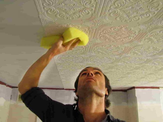 В этом случае нет решения, как помыть потолок покрашенный водоэмульсионной краской. Единственный выход – это заново покрасить поверхность, поскольку применять моющие составы, содержащие химически активные компоненты, не рекомендуется.