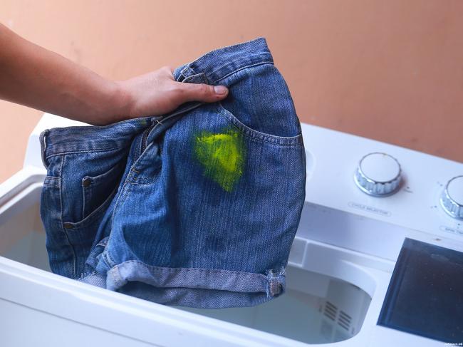 - Отстирать одежду от загрязнений лакокрасочными веществами также возможно. Для этого надо замочить вещи в теплой воде со стиральным порошком. Для еще большей эффективности на пятна налейте средство для мытья посуды и оставьте на час. Затем хорошенько потрите одежду.