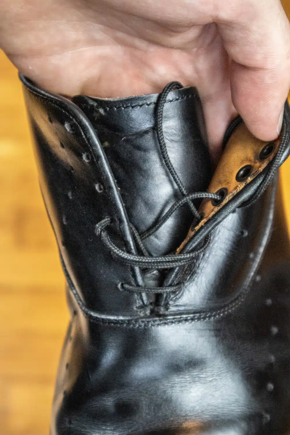 Процесс шнуровки продолжается пока оба конца шнурка не будут продеты в верхние отверстия и не выйдут внутри ботинка.
