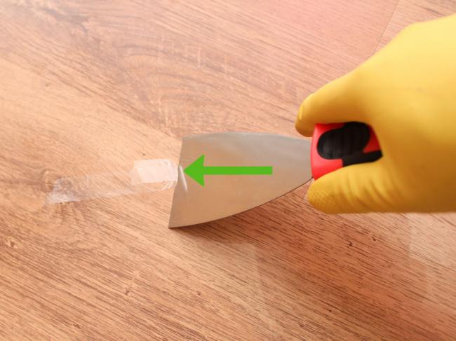 Как помыть ламинат от обойного клея? Сначала он соскребается с поверхности, затем это загрязненное место протирается чистой водой.
