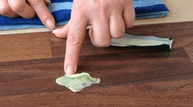 - Паста жиже, чем мастика. Нанесите её пластиковым шпателем на вычищенную царапину, разровняйте, протрите влажной губкой, а затем сухой мягкой тряпкой. Прикройте место чем-нибудь. Ходить по нему можно через пару часов.