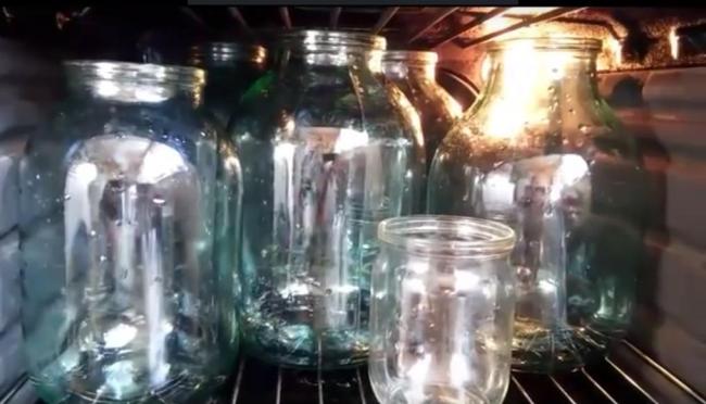 В духовке стерилизуют и заполненные банки. Поставьте их в духовку без крышек. Разогрейте духовку до 100 градусов. Минимальное время стерилизации после достижения нужной температуры — 10 минут (для банок 0,5 л), 15 минут – (для 1 л). После этого аккуратно достаньте банки и сразу закатывайте простерилизованными крышками. Банки поставьте вверх дном до остывания.