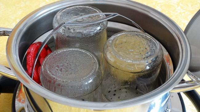 Наполните кастрюлю водой примерно наполовину и дайте закипеть. Положите в кастрюлю крышки, а сверху поместите дуршлаг или сито. Поставьте сверху сухие банки горлышком вниз.