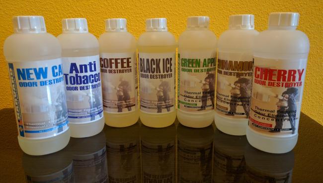 Из средств человека который занимается этой услугой мы выбрали 3 наиболее приятные запахи для нас. Выбор пал на запахи кофе, черный лед, анти-табак. Выбор сугубо индивидуален, я выбрал более легкий запах кофе. Два приятеля взяли концентрированный запах черного льда, которые напоминает запах разбитого флакона духов в машине. Хотел бы подчеркнуть, не все жидкости устраняют запах. А лишь те в которых указано. Так же есть перечень с запахам чего, справляется лучше.