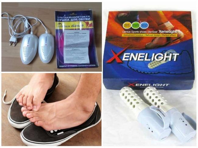 Для обработки обуви предпочитают использовать устройства, излучающие ультрафиолет, – Ксенелайт и Тимсон. Благодаря излучению и горячей температуре грибок погибает. Эти приборы «питаются» от сети. Многим не нравится этот способ из-за длительности обработки, но зато он действенный.