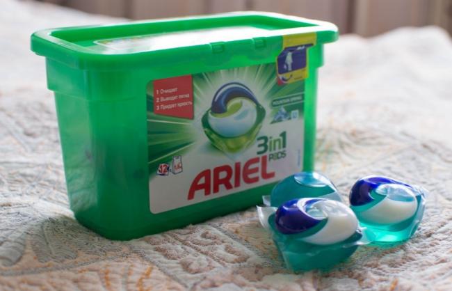 Весьма популярный продукт среди чистящих средств. Производится как для белого, так и для цветного белья. «Бомбочки» зеленого цвета предназначены для светлого белья, а фиолетово-синие для цветного. Вещества, содержащиеся в препарате, восстанавливают ткани ее оттенок и повышают яркость красок. Судя по отзывам, изделие от известного во всем мире производителя наносит мощный удар по самым сложным загрязнениям, выводя их всего за одну стирку. При этом, продукция фирмы Ариэль придает ткани мягкость, не разрушая ее структуру и сохраняя цвет вещей. Компания Ариэль выпускает как моющее средство, состоящие из двух компонентов, так и трехкомпонентные – то есть либо гель и пятновыводитель, либо добавляя третье вещество – кондиционер.