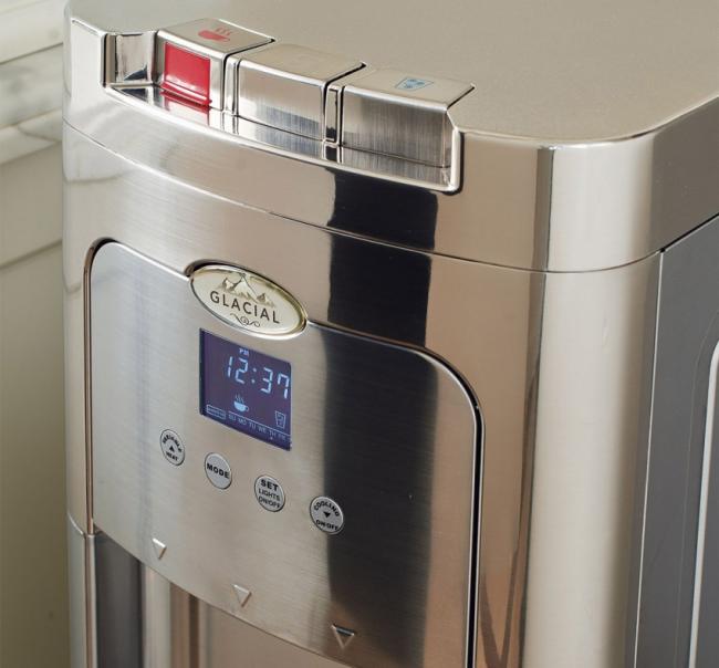 - С холодильником. Встроенная камера позволяет эффективно использовать каждую часть кулера. Компрессорная система охлаждения регулярно поддерживает нужную температуру. Устройства премиум-класса имеют ЖК-дисплеи, где отображаются все заданные параметры. Кулер с холодильником будет полезен в офисе.