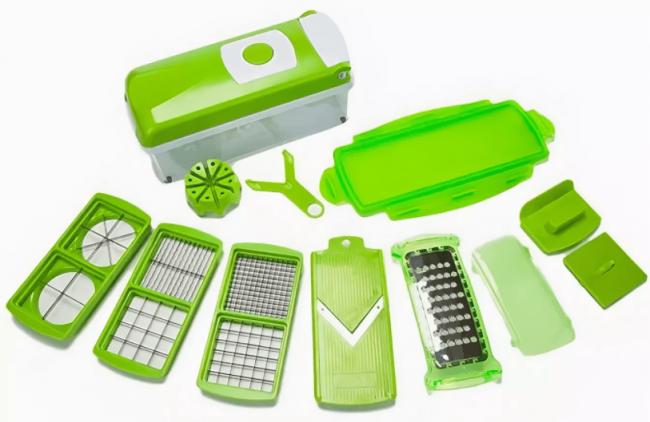 Перед вами чудо-терка, по-другому не назовешь. Она получила массу восхищенных отзывов покупателей и ей, правда, есть чем похвалиться. Mandoline Slicer значительно экономит время, имеет контейнер (куда можно положить овощи или фрукты), 6 ножей и насадку для овощей.