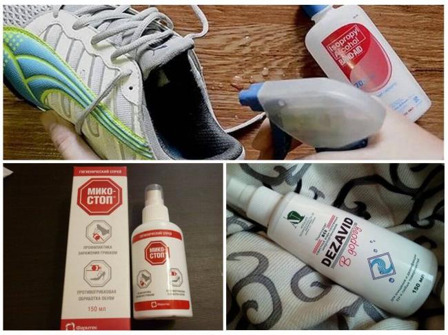 Помимо электроприборов люди пользуются различными спреями и аэрозолями для дезинфекции обуви во избежание появления грибка. Обычно в состав таких средств входят: