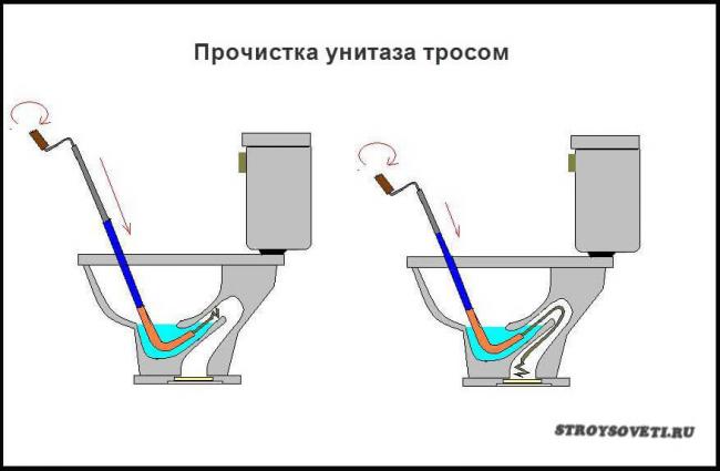 Сперва из чаши унитаза убирают всю воду. После этого спиралевидный конец троса необходимо опустить до упора в его горловину. Вращая по часовой стрелке рукоятку троса, гидрозатвор медленно проталкивается по каналу. Засор при этом разрушается и проталкивается вперед, что приводит к его полному уничтожению. В конце всю систему следует промыть горячей водой.