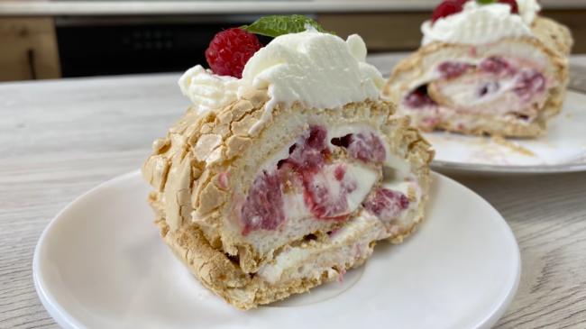 Меренговый рулет Павлова подходит для праздничных застолий и вкусного чаепития. Большие кружочки хрустящего безе с нежной сердцевиной, увенчанной малиновым конфитюром словно тают во рту.