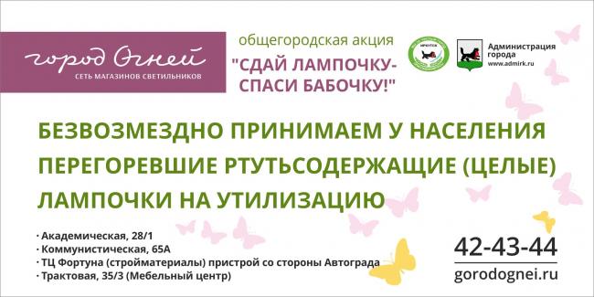 2. Общегородская акция «Сдай лампочку, спаси бабочку», организованная администрацией города Иркутска совместно с сетью магазинов «Город Огней». Прием отработанных ртутьсодержащих ламп осуществляется во всех филиалах сети.