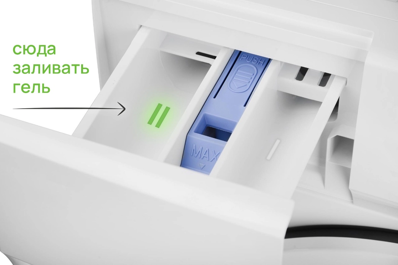 - Жидкий гель для стирки обычно наливают в специальный отсек стиральной машины, отмеченный значком “гель”. Если такого отсека нет, можно наливать гель прямо в барабан стиральной машины перед запуском программы.