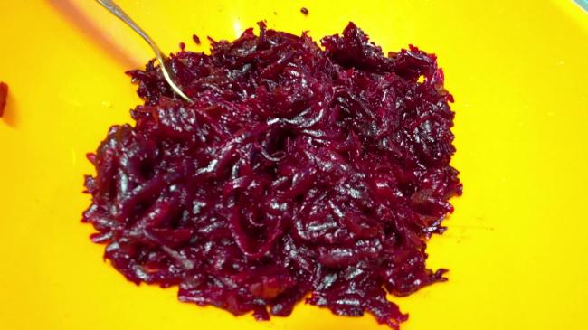 - Как известно, свёкла содержит большое количество красящих веществ, которые при контакте с другими овощами окрашивают их в яркий бордовый цвет. В винегрете это особенно заметно. Для того чтобы нейтрализовать подобное воздействие, уже готовую мелко нарезанную свёклу нужно сбрызнуть подсолнечным маслом. Так она оставит всю свою замечательную цветовую гамму при себе.