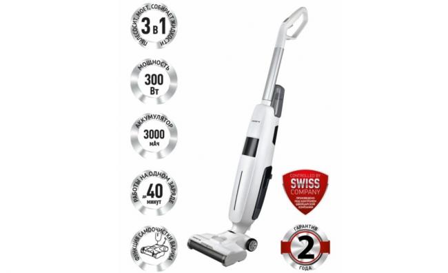 Этот беспроводной пылесос оснащен функцией влажной уборки и имеет съемный ручной блок. В нем есть резервуар для воды, куда можно заливать жидкость через специальное отверстие на корпусе, и щетка для удаления грязи и волос. Мощность всасывания составляет 400 Вт.