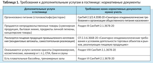 Рассмотрим стандартный пакет услуг, который гости получают чаще всего, и подскажем, где искать требования к оказанию этих услуг (табл. 1).