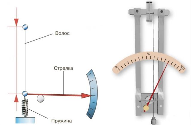 - Волосной гигрометр. Действие данного прибора основано на свойстве обезжиренного человеческого волоса изменять длину при изменении влажности воздуха, что позволяет измерять относительную влажность. Волос натягивается на упругую металлическую рамку. Изменение длины волоса передаётся по стрелке, которая перемещается по шкале, проградуированной в единицах относительной влажности.