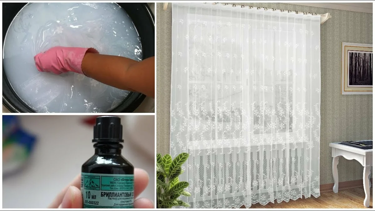 В полученном растворе тюль замачивается 2-3 минуты, после чего ее необходимо тщательно прополоскать чистой водой. Раствор с солью и зеленкой вернет занавескам упругость и придаст белоснежный оттенок, однако если добавить слишком много бриллиантовой зелени, то на них может появиться бирюзовый налет.