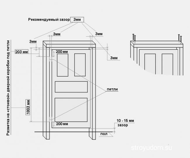 При сборке дверной коробки следует учитывать следующие зазоры: между дверью и верхом коробки (около 3-5 мм), между дверью и сторонами коробки (порядка 3 мм), между дверью и порожком (10-15 мм).