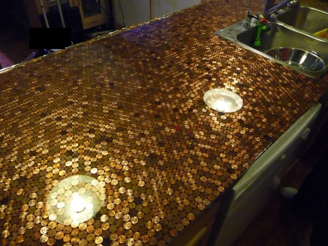 Очень красиво смотрятся столешницы, где деревянные части чередуются с прозрачными вставками. Для этого также можно воспользоваться стеклом в качестве основы, на котором выкладываются деревянные фрагменты, а расстояния между ними заливаются эпоксидной заливкой.