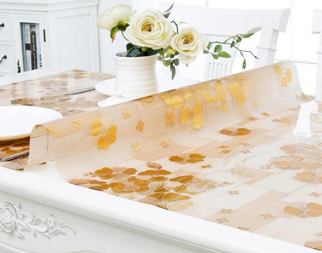 Положив такую прозрачную скатерть “мягкое стекло” на поверхность стола, можно быть уверенным в том, что продуктовые крошки и средства бытовой химии не будут наносить ей ущерб, а красители и капли жира не будут впитываться в поры. Использование такой скатерти существенно продлит эксплуатационный период столешницы.