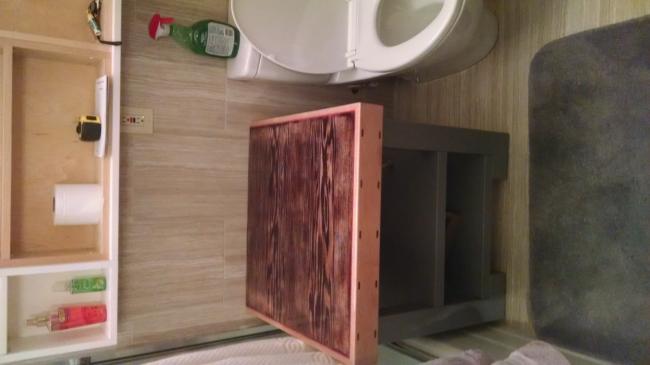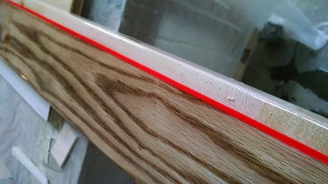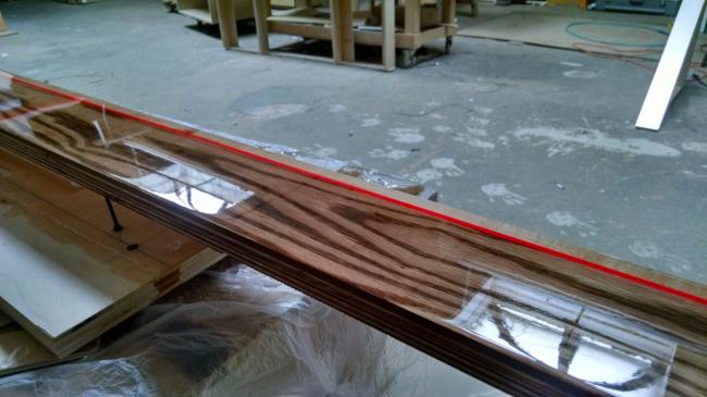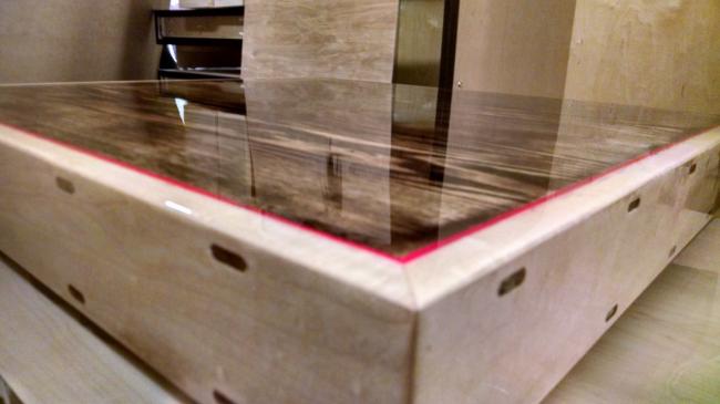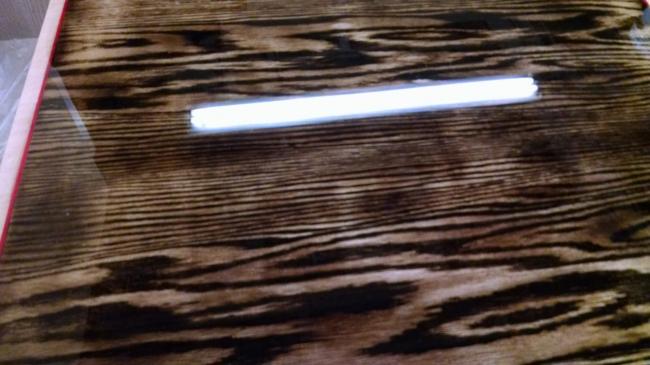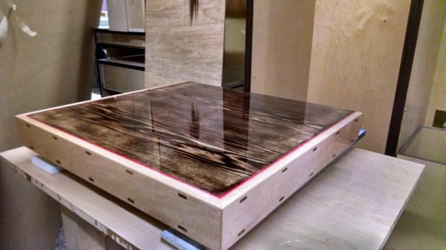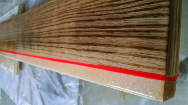 Эта деталь не имеет отношения к столешнице фотографировать которую начал с момента наложения жидкого стекла, но процесс идентичный. Изготовляем столешницу в данном случае из МДФ шпонировонного дубовым шпоном. Готовим рейки шириной 1″ из любого массивного дерева которые в последствии не только будут крепиться на торцевую часть добавляя прочность изделию, но и будут являться чем то вроде элемента декора. В данном случае что бы получить более проявленную фактуру дуба я пользовался паяльной лампой для обжига шпона (сразу замечу, что особого фанатизма надо избегать, не забывайте это шпон, не прожгите его) затем легкая шлифовка после которой только фактурные углубления останутся затемненными. Обходим торцы массивом и снова шлифуем.